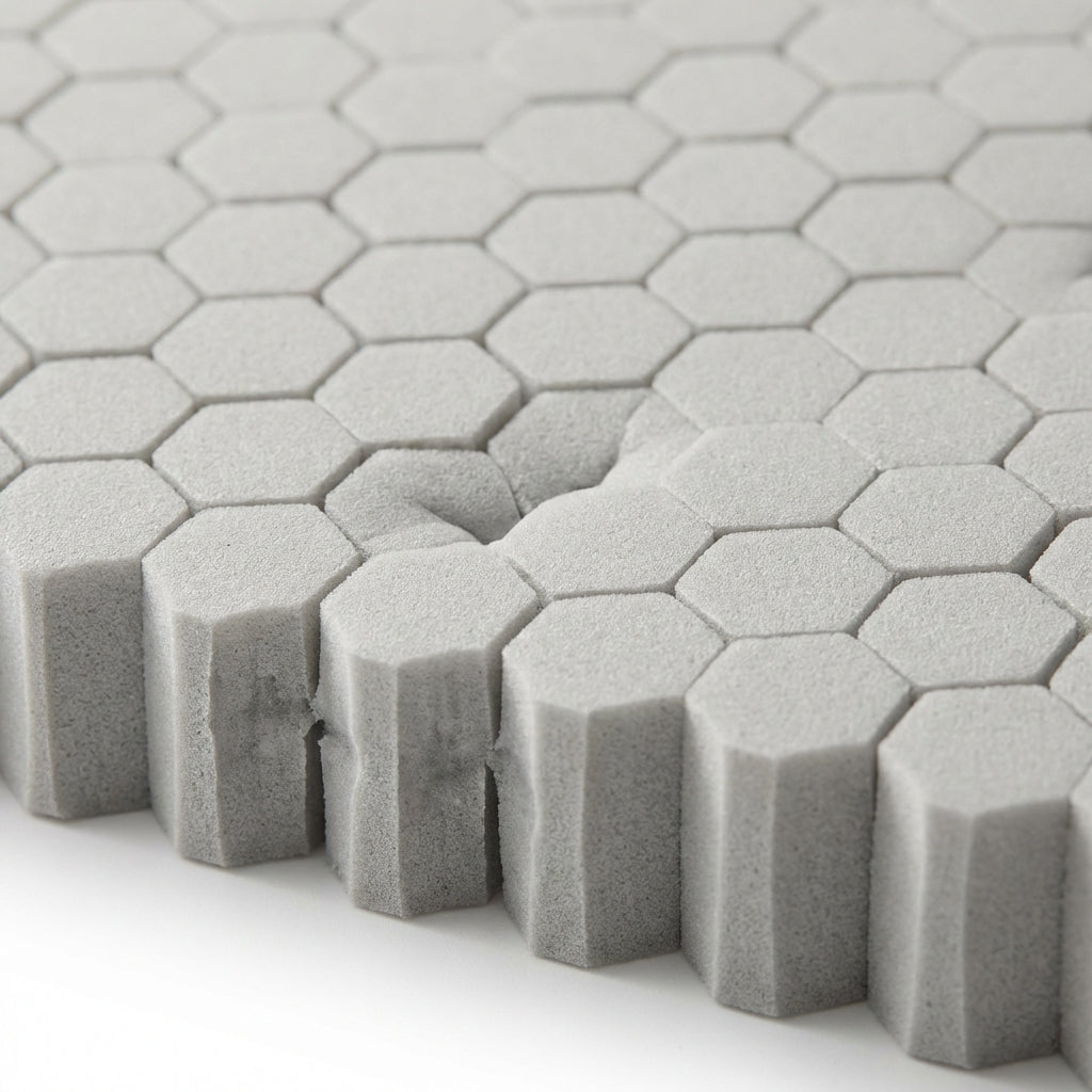 Hexagonal cells distribute impact force laterally across the surface, instead of concentrating it at a single point like rigid plastic does. The foam dynamically compresses on impact and springs back instantly — absorbing up to 90% of the energy before it reaches the bone.